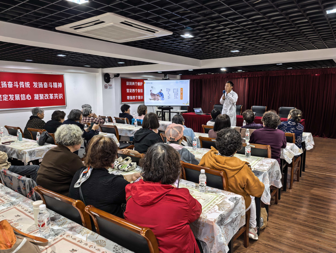 10月17日,活動來到三林鎮綜合為老服務中心。徐浦中醫醫院專家為老年居民帶來秋冬養生科普講座,結合中醫理論,講解季節性疾病預防、飲食調養等實用知識,并現場演示八段錦養生功法,引導居民科學養生。講座結束后,專家團隊繼續為居民提供把脈問診服務,針對高血壓、糖尿病等慢性病,給出用藥指導和生活建議。一位參與講座的阿姨說:“醫生講得很清楚,我學到了很多秋冬養生的方法,希望以后能多舉辦這樣的活動。”